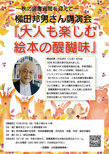 【申込先】 10/1日(水)午前9時から図書館貫井北分室へ直接または図書館HPお問合せフォーム、お電話(042-385-3561)でお申込みください。